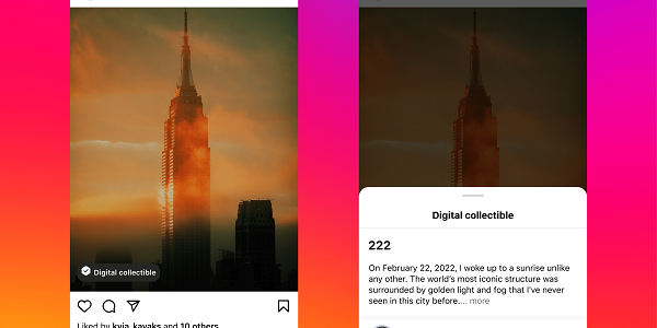 Como puede ver en este ejemplo, los NFT en Instagram se mostrarán con una etiqueta de «coleccionables digitales» que, cuando se toque, mostrará información sobre el creador del trabajo y la propiedad de ese artículo digital.