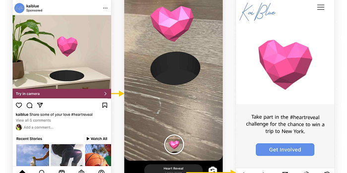Como puede ver aqu, los anuncios AR de Instagram, integrados en su plataforma Spark AR, invitarn a los usuarios a interactuar con el contenido de su anuncio, que tambin podra incluir el posicionamiento virtual. muebles en su casa, o probar la conduccin de un coche en la aplicacin.