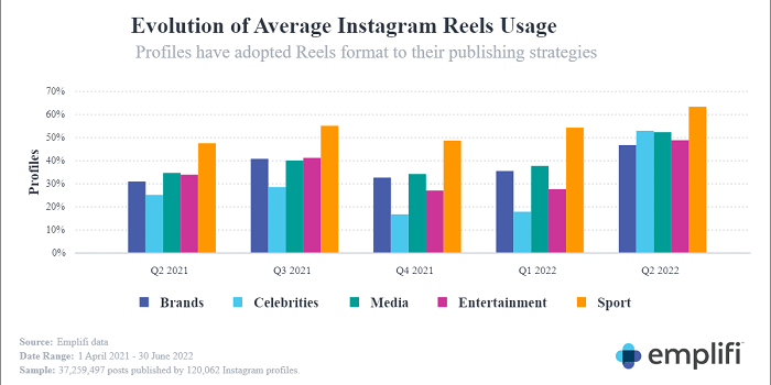 En el segundo trimestre de 2022, los datos de Emplifi encontraron que casi la mitad de las marcas en Instagram publicaron al menos un carrete, en comparacin con el 30 % hace un ao. El formato es el ms popular en el sector deportivo, con ms del 60 % de los perfiles compartiendo Reels, aunque otras industrias le siguen de cerca.