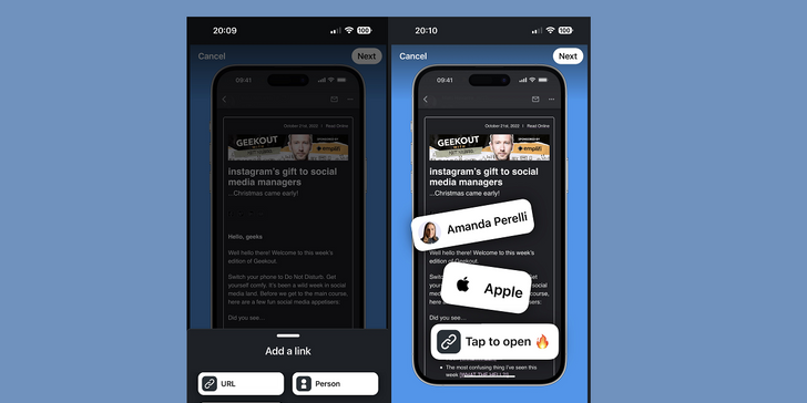 Como puede ver en estas pantallas de ejemplo, publicadas por un experto en redes sociales mateo navarraahora, además de la etiqueta de enlace original, que le permite pegar una URL de su elección en la parte superior del marco, ahora también puede vincular a perfiles internos, lo que podría ayudar a generar más participación en la aplicación.