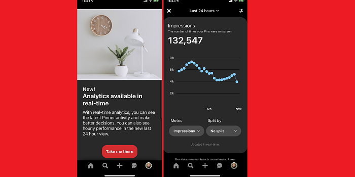 Como puede ver en estas pantallas de ejemplo, compartidas por el usuario Yasser Masood, Pinterest está alertando a los usuarios sobre la actualización en la aplicación móvil. Los conocimientos en tiempo real también están disponibles en la plataforma de análisis web, pero ahora también podrá acceder a gran parte de los mismos datos sobre la marcha, que es probablemente donde muchas más personas buscan registrarse.