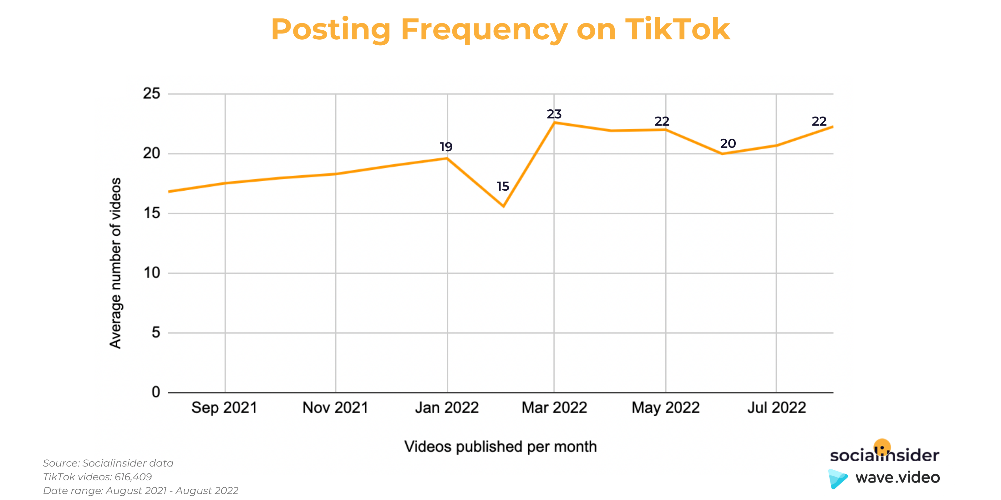 Con una frecuencia promedio de publicacin de TikTok de 20 videos por mes y creciendo ao tras ao, como lo muestran los datos, TikTok tiene el potencial de convertirse en la plataforma de redes sociales con el ROI ms alto muy pronto.