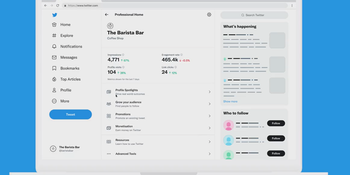 Como puede ver en este ejemplo, la nueva pantalla de inicio profesional proporciona una descripción general rápida de todas sus estadísticas clave de rendimiento, incluidas las impresiones totales de tweets, la tasa de participación, las visitas al perfil y los clics en enlaces.